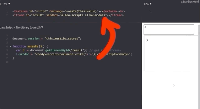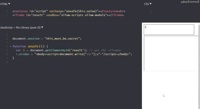 <iframe id="result" sandbox="allow-scripts allow-modals"></iframe>Our previous example of summing 1 and 2 still works.