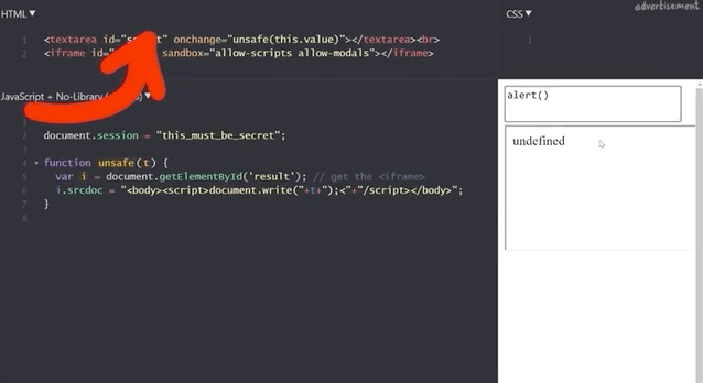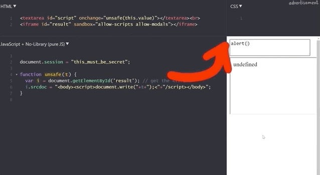Let's now modify the script a little to have the script execute within an iframe. We write the new unsafe function as