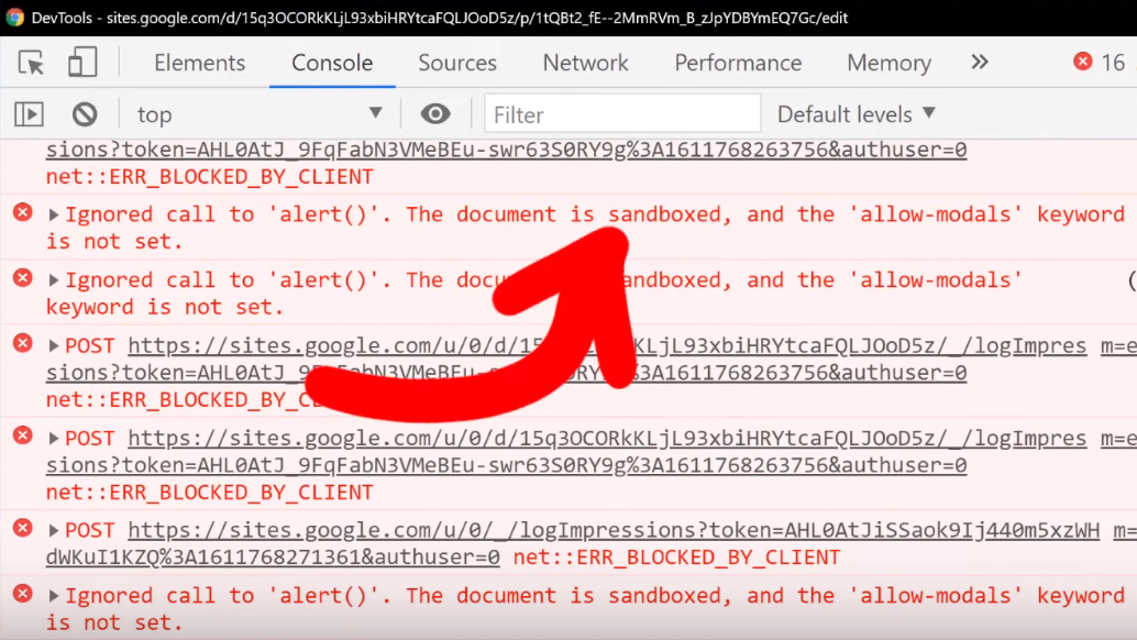 We can further investigate this if we use the console log using the browser's developer tools. You might notice in the log that the alert(1) is blocked by a sandboxed iframe. Remember to use filtering if you can't find it in the log.