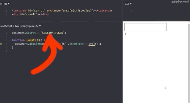 document.secret = "SESSION_TOKEN";which we can steal by injecting alert(document.secret), as the resulting window pop-up reads SESSION_TOKEN, demonstrating the success of the method.
