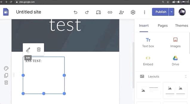 When you find an injection into a sandboxed iframe, typically the allow-modals option in the sandbox attribute is not enabled. For instance, with sites.google.com, we can create our own webpage. Let's use it to embed some raw HTML and JavaScript!
