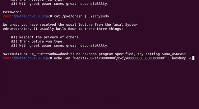 We pipe in our malicious input into our new sudo build, and let sudo crash with ASAN keeping watch! It... didn't crash. What? We get a password prompt, and then another memory leak? What is going on?