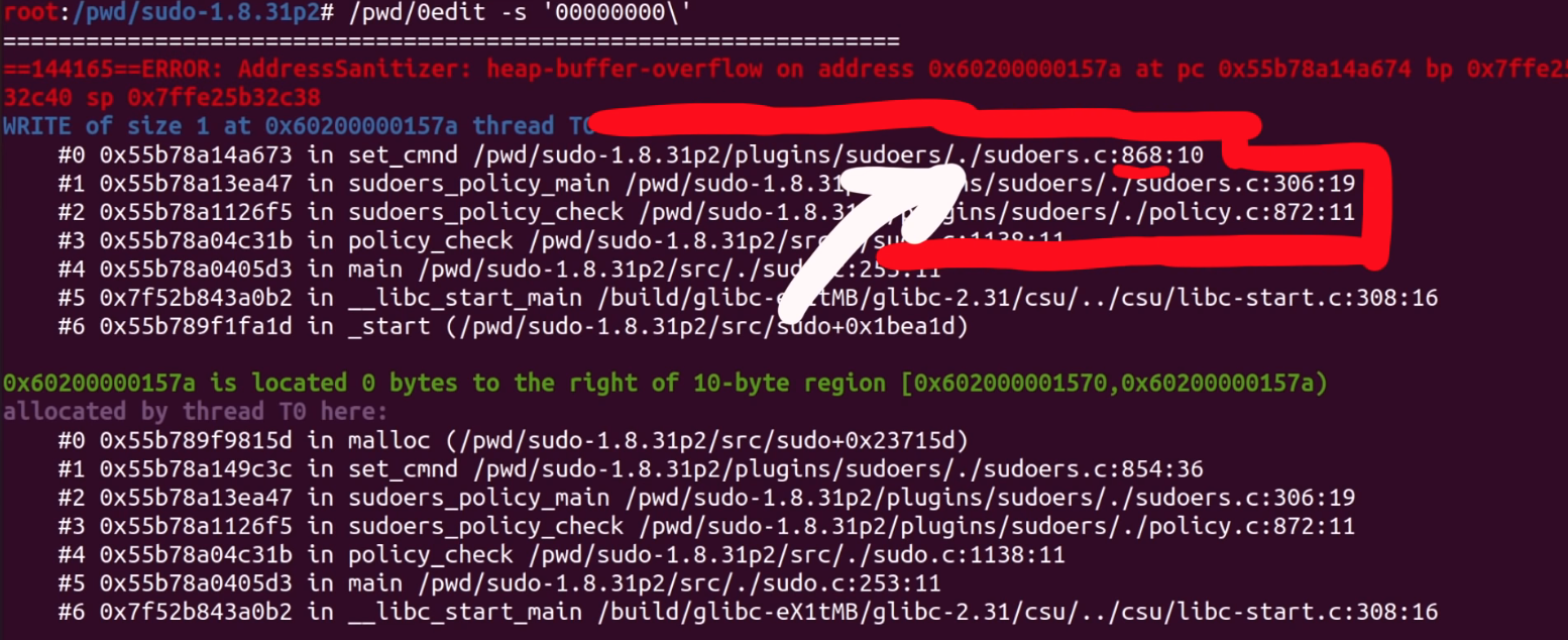 Now that we have a working and proper sudo build that involves ASAN and disabled shared libraries. When we test the crash (again), we get painfully clear information about which file and which code line the crash happened at. There we go! Thank you, ASAN. Now, let's have a gander.