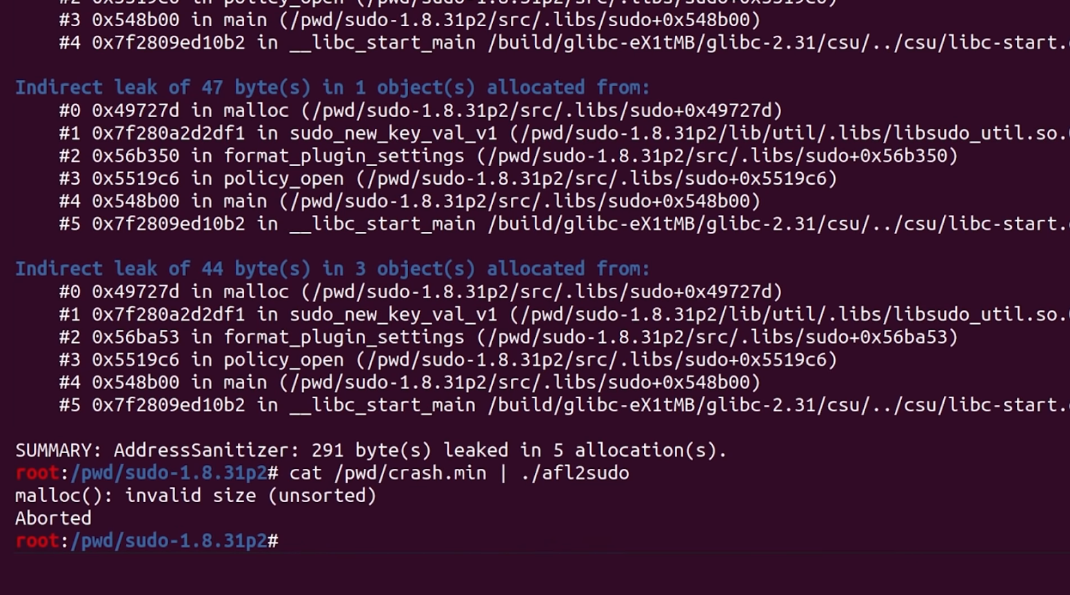 Back to the memory leak: throwing the input at the normally-compiled sudo via our wrapper still works. What gives? There are a few things that we can consider from here.