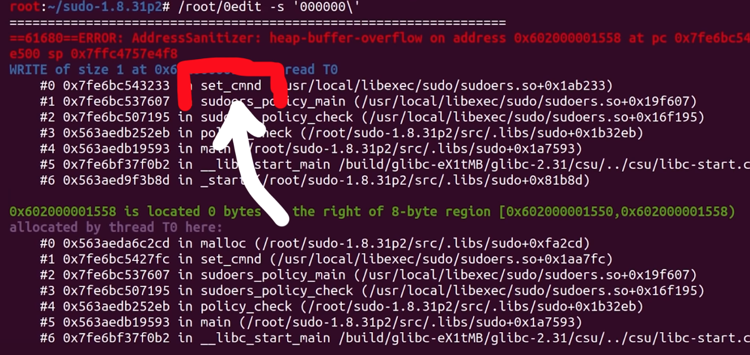 It's time for more sanity-checking. Here is a previous Docker system where sudoedit clearly crashes – and that was built from the same source, just without ASAN. In our desperation, we decided to install this ASAN version of sudo as the system version with make install. We created the symbolic link from that new ASAN sudo version as 0edit, tried it, and bam! It works?! Indeed it does: ASAN reports a heap buffer overflow at a specified address. This left us pleased, yet confused. Why did this happen? What was our mistake?