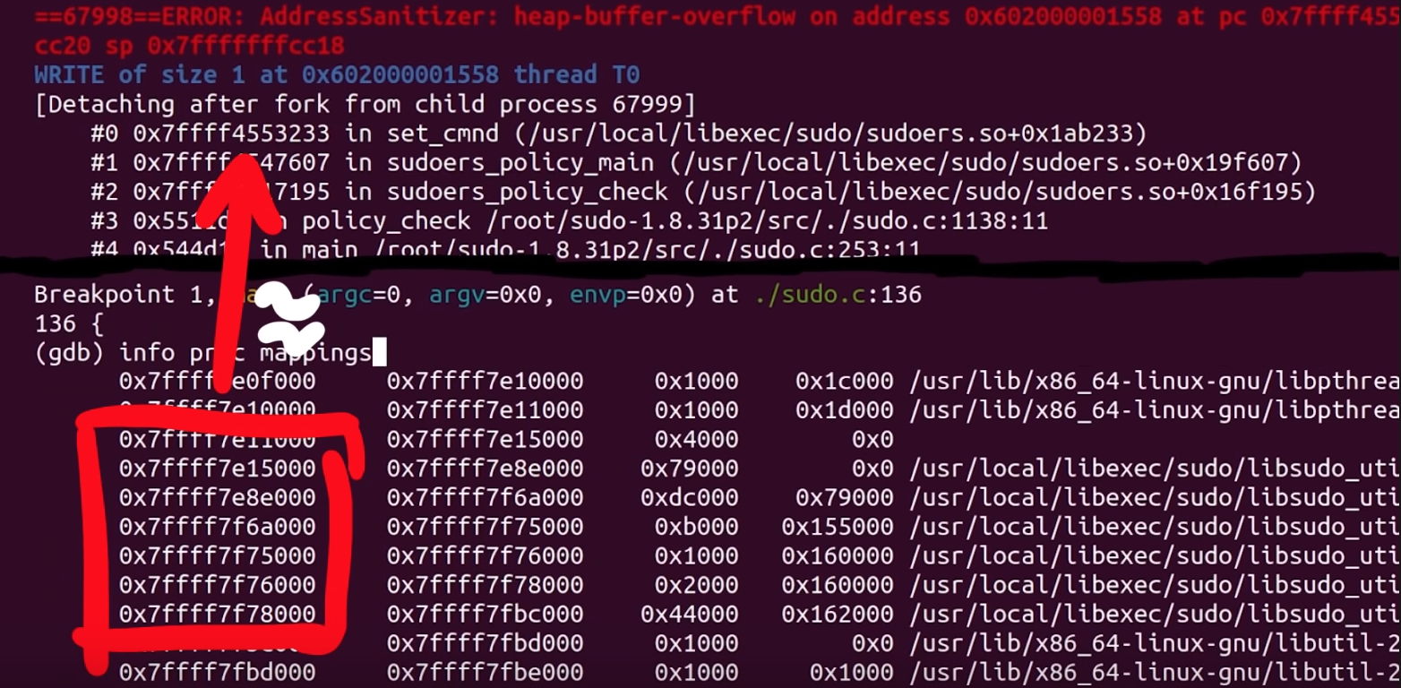 We tried to set a breakpoint to set_cmnd(), but the breakpoint isn't hit, and thus this approach didn't work. Looking more closely, we noticed the address range of this function: looks like a library address! As a result, we considered the virtual memory map for the sudo process; we can see that the address previously listed must belong to an already-loaded library, perhaps the libsudo_util one.