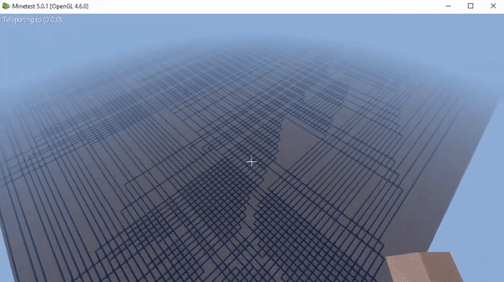 When I loaded into the map I fell down. But like with Minecraft, I assumed there must be features in creative mode to fly and teleport around. And in the keybindings I was able to find shortcuts for flying, noclip and even faster movement. And from the Minetest wiki I learned about the console and the teleport command.