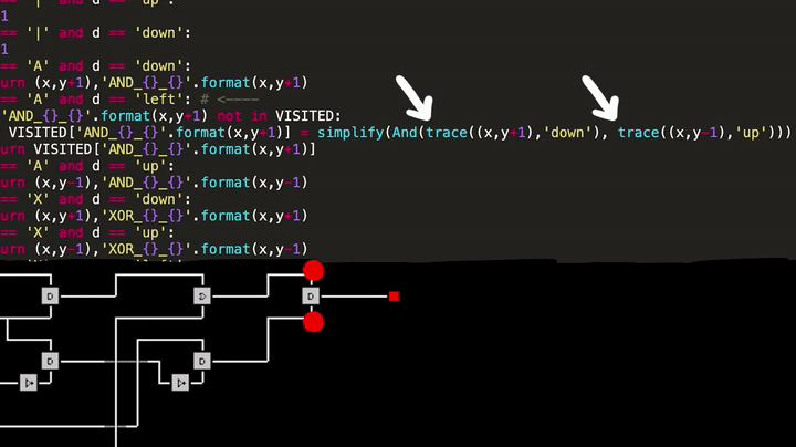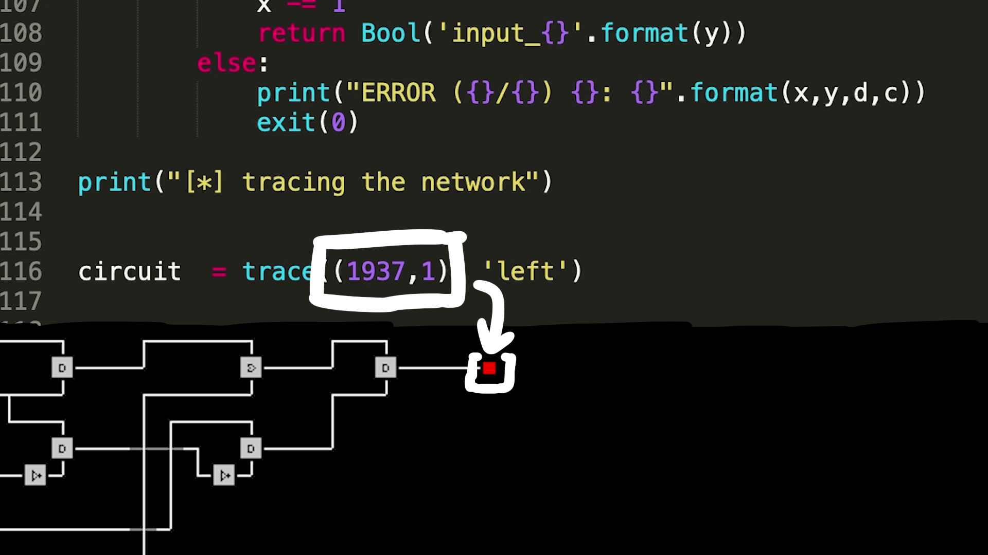 I created the function trace() which takes a coordinate and a direction. This is the coordinate of the final output. And we are tracing to the left (in the way I have oriented the grid the circuit goes to the left).