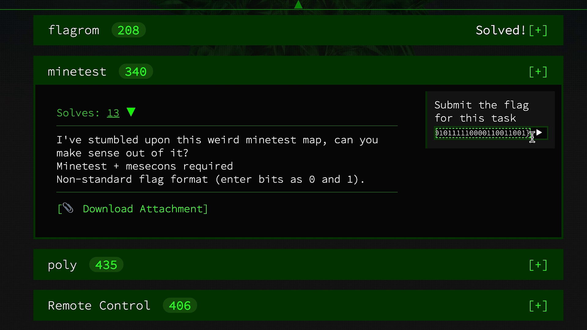 But there is one difference. In Pwn Adventure the circuit was fairly small and could be reversed by hands in a matter of a few hours (as have teams done during the original CTF). However this Minetest challenge is insane. No chance to do this by hand.