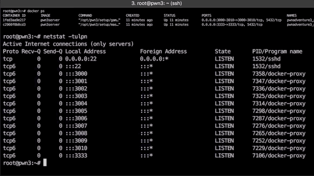 netstat -tulpnYour docker should be running a game and a master container, and the docker proxy processes should be listening on a few ports. The outputs of the commands should look something like this: