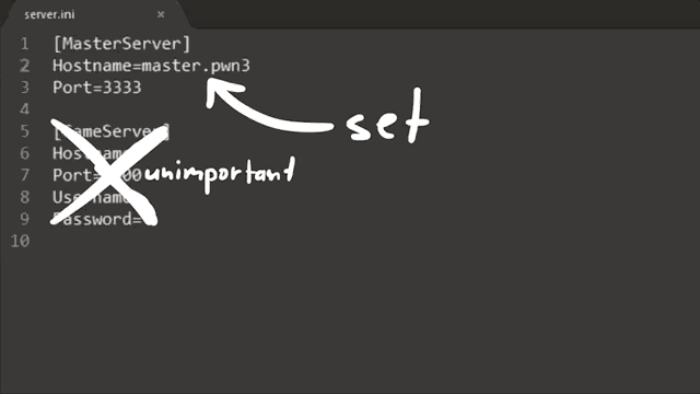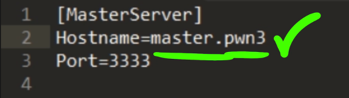 You also need to edit the server.ini file in the client folder. You need to change the hostname to master.pwn3, or whatever your master docker container image name is. Note: do not put in an IP address, as it won't work.
