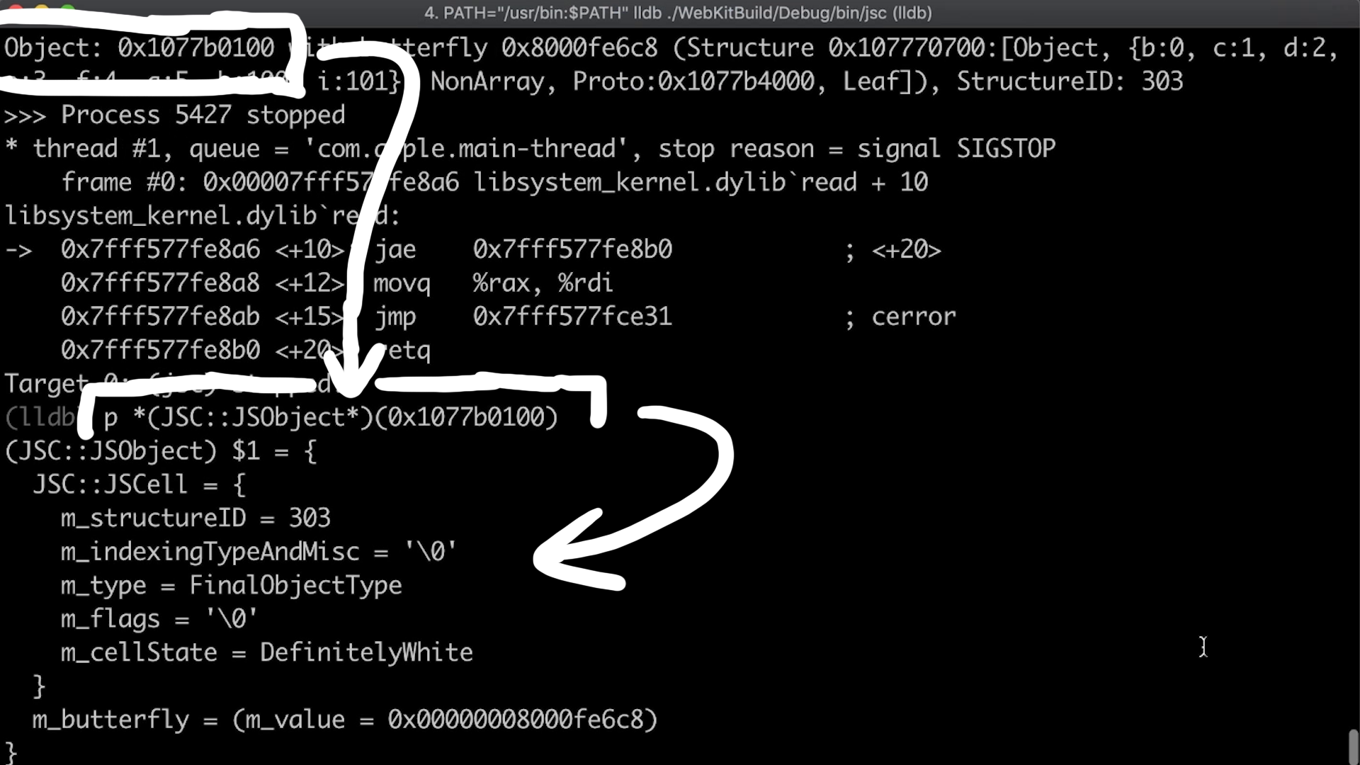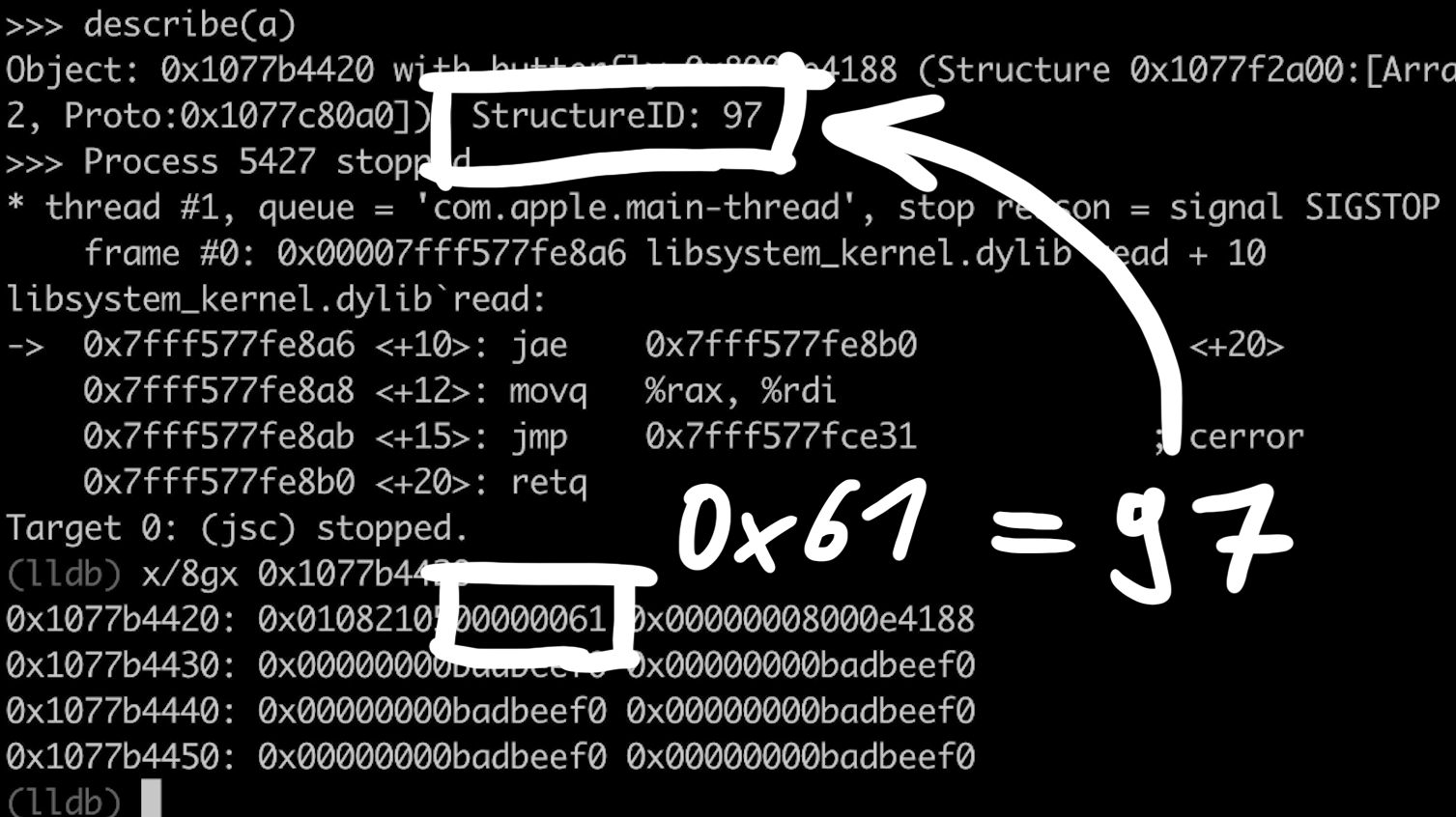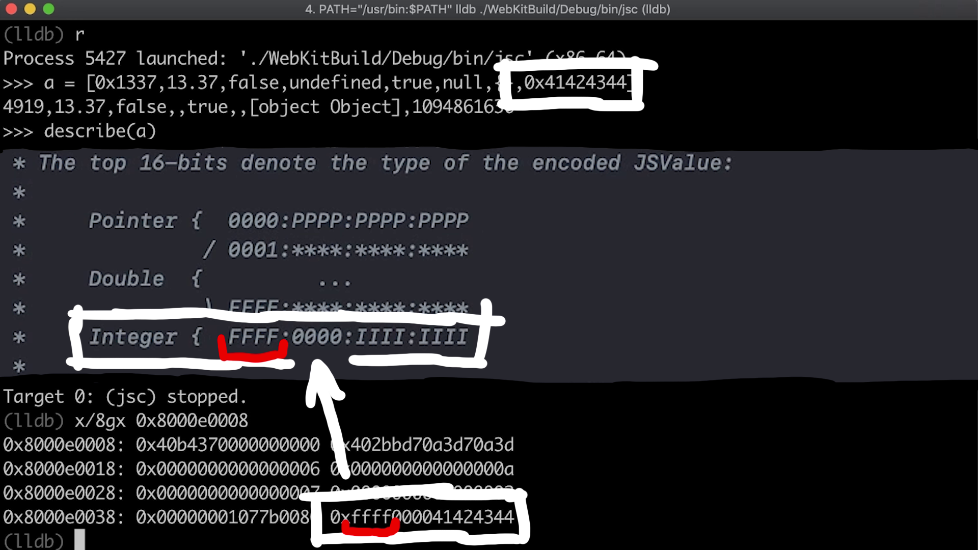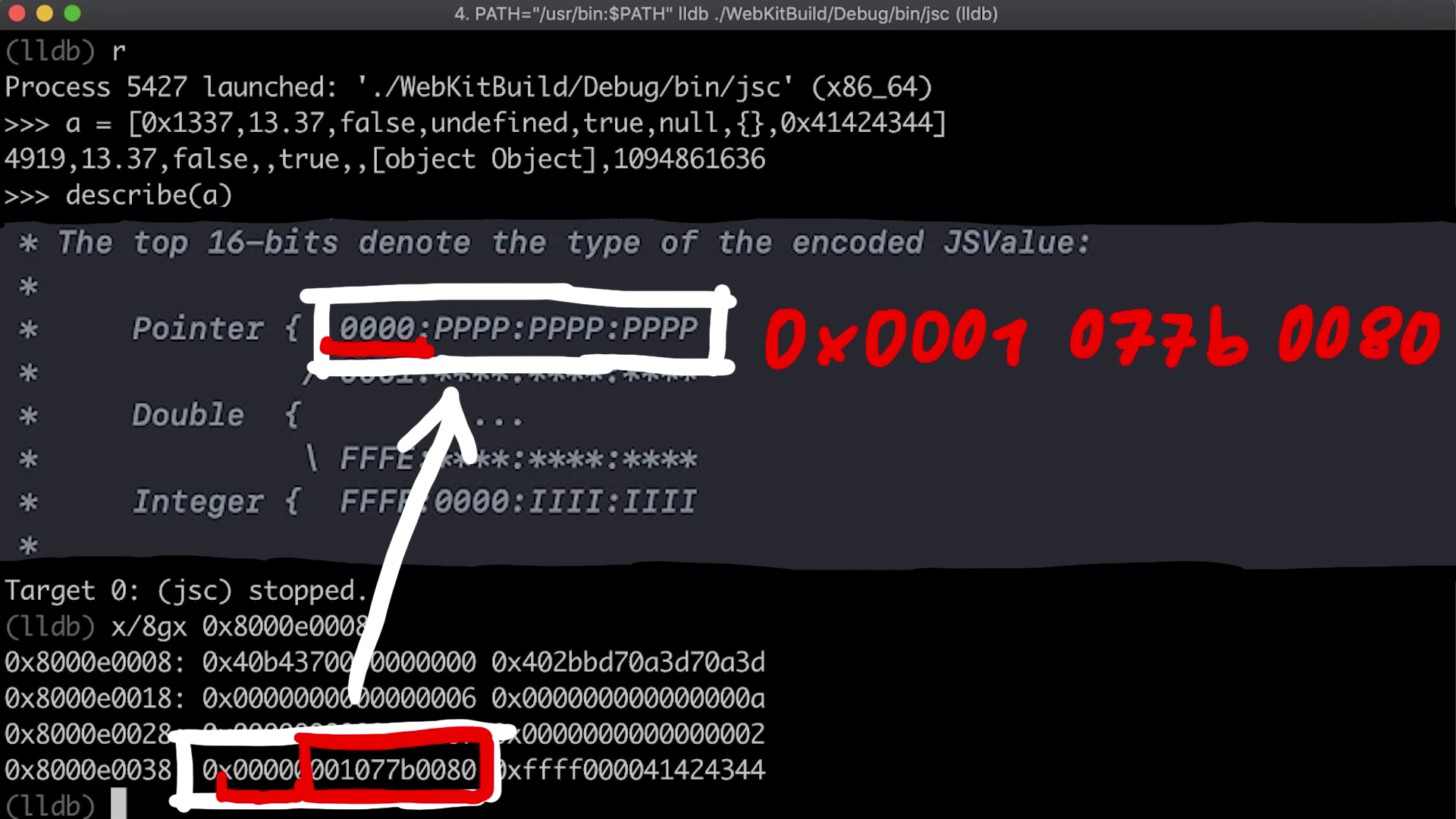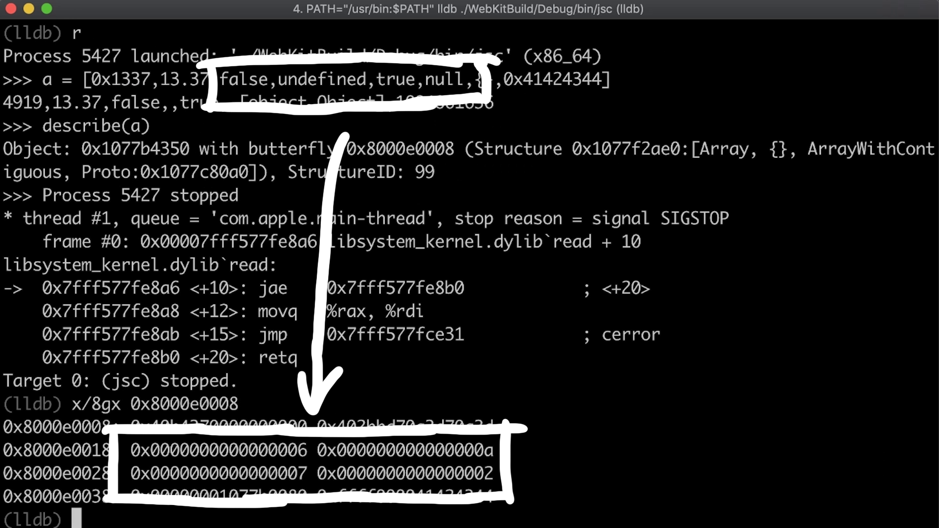 Let's learn more about JavaScriptCore internals, by looking at the structure of JSObjects in memory. This is well explained in saelo's phrack paper Attacking JavaScript Engines, but I hope I can add to this by playing with the debugger from last post. In the last part we already had a quick peek into the memory of an array [1, 2, 3, 4] and found those numbers, but we also saw that it had all the high bits set to 0xffff - we will also learn what's up with that.