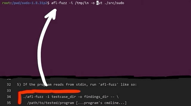 afl-fuzz -i /tmp/in -o /tmp/out ./src/sudoAnd... that's a crash.