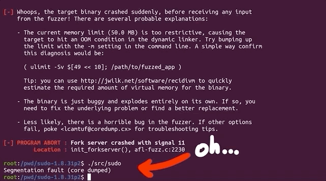 gdb. The segmentation fault happens in afl's own code!This is something that we need to look into. In the interest of video and article length, we'll end the first part of the series here. So much for a quick 20-minute, in-out project where we throw afl-fuzz at sudo and call it a day, right?